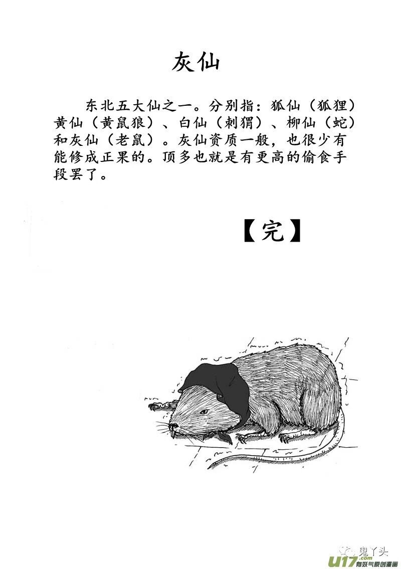 灰仙东北五大仙之一。分别指:狐仙(狐狸)黄仙(黄鼠狼)、白仙(刺猬)、柳仙(蛇)和灰仙(老鼠)。灰仙资质一般,也很少有能修成正果的。顶多也就是有更高的偷食手段罢了。