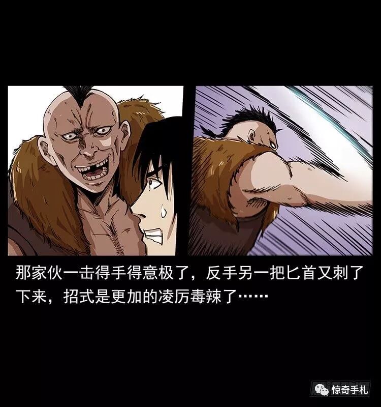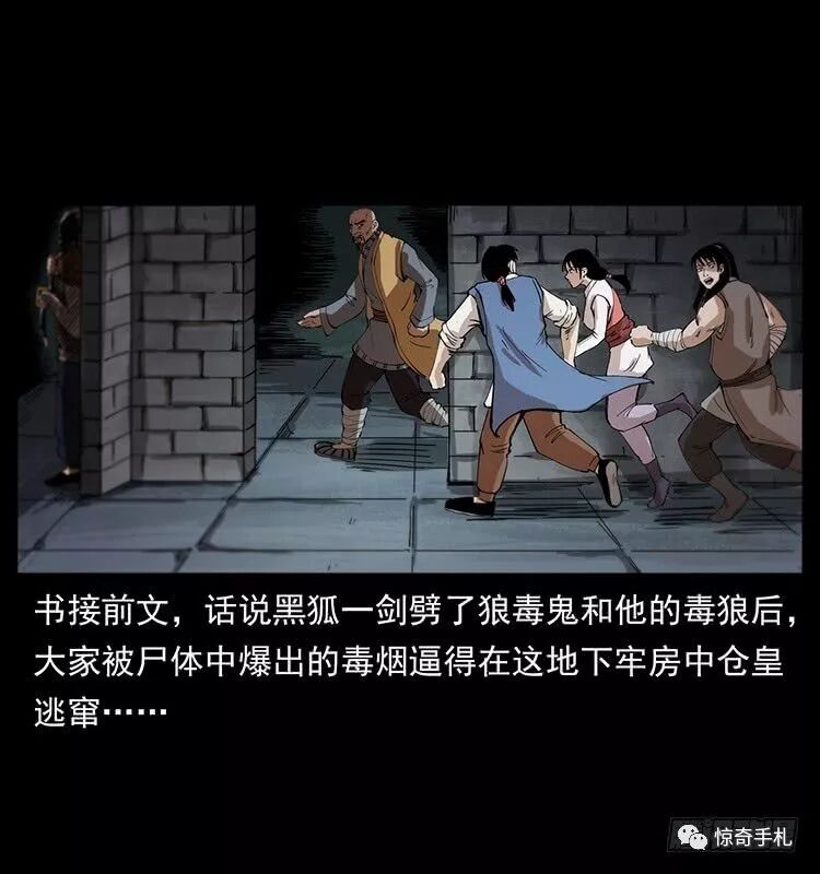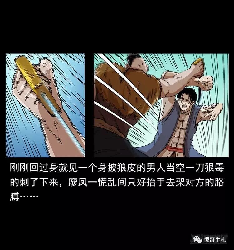 书接前文,话说黑狐一剑劈了狼毒鬼和他的毒狼后,大家被尸体中爆出的毒烟逼得在这地下牢房中仓皇逃窜,几个人七拐八拐的忙于躲避毒烟,却不知道这里面除了那狼毒鬼外还有其他的埋伏,正当几个人跑到一个拐角处之时,廖凤一突然感觉到脑后有一阵劲风袭来。刚刚回过身就见一个身披狼皮的男人当空一刀狠毒的刺了下来,廖凤一慌乱间只好抬手去架对方的胳膊。可万没想到那家伙使的是双刀,这只手被挡另一只手中的利刃接着就扫了过来,把廖凤一的肚子登时划开了一条口子……